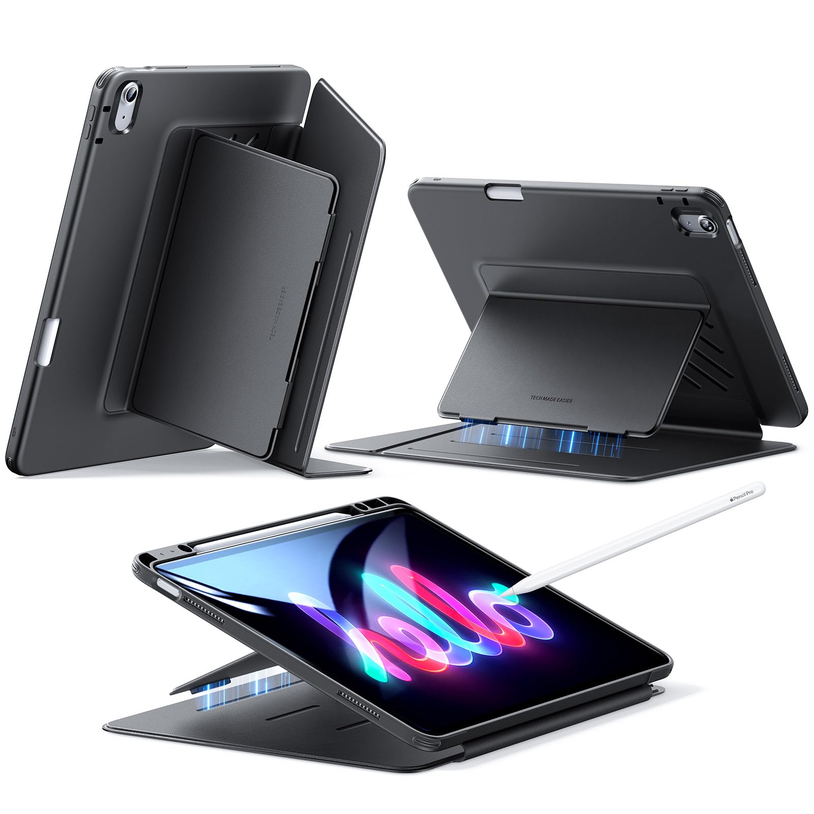 Suporte ultraestável: os amplos suportes se encaixam magneticamente em ranhuras na base, proporcionando estabilidade superior, mesmo ao usar o iPad Air no colo.