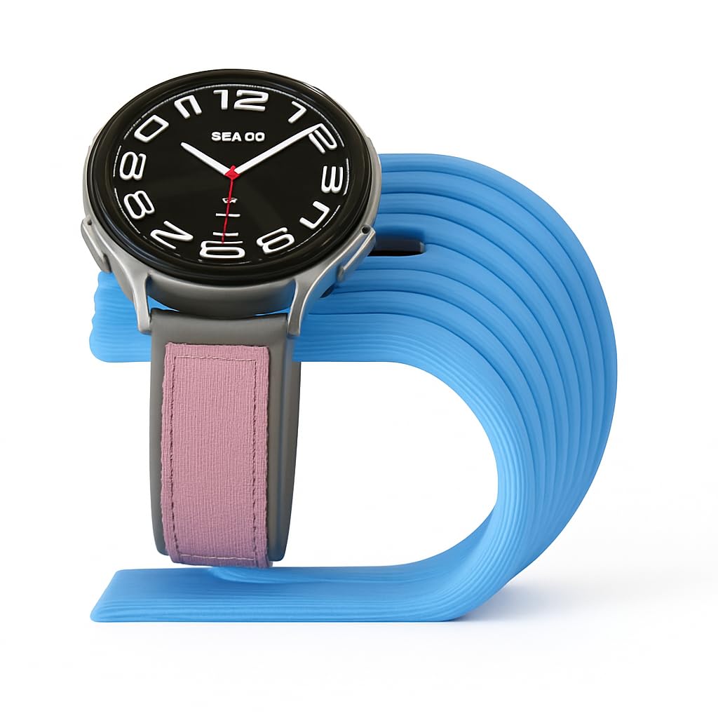 Apresentamos o StandWave, um suporte elegante e funcional projetado especificamente para carregar seu Galaxy Watch 5, 5 Pro, 6, 7, 8 e Ultra. Com design ondulado distintivo, este suporte oferece uma solução estilosa para exibir e carregar seu smartwatch. Fabricado com materiais duráveis, o suporte apresenta acabamento em preto sofisticado que complementa qualquer ambiente. A base estável mantém seu relógio seguro durante o carregamento, enquanto o design ergonômico permite fácil acesso à tela. Importante: o carregador não está incluído - este é apenas o suporte. Compatível com toda a linha recente de Galaxy Watch, este acessório é perfeito para sua mesa de trabalho ou criado-mudo. O design permite visualizar facilmente as notificações e horário enquanto o relógio carrega. A construção robusta e o acabamento premium garantem durabilidade para uso diário.
